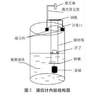 該方案的設(shè)計(jì)結(jié)構(gòu)圖如圖2所示。它主要由雙頻激光干涉儀、雙浮子(內(nèi)設(shè)錐體棱鏡)、導(dǎo)向鋼絲繩等組成。激光器和浮子用于液位測(cè)量。