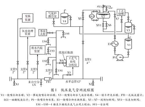 (1) 通過對低壓氮氣管網的分析、排查得知,V2出水閥門(X6、XV1)內漏導致V2滿液后水經X5閥進入了低壓氮氣水平總管,使氮氣露點升高。