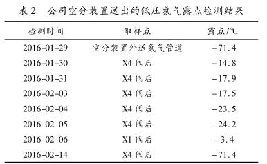 2016年2月14日在X4閥處檢測氮氣的露點為-71.4℃,與空分裝置外送氮氣的露點一樣,表明低壓氮氣管網中的水已經完全排出。