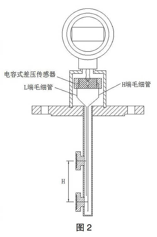 我們設想用差壓原理,將差壓高壓端(H端)做出充油的毛細管和受壓膜盒,毛細管加膜盒長度為從帶壓容器上的連接器到容器底部;差壓變送器低壓端(L端)也做一個膜盒,膜片直徑同高壓端的膜盒。這個膜盒置于上端的容器內,連接器下,也可以置于連接上邊的封閉腔室內,封閉腔室與連接器(法蘭)上有差壓傳感器低壓端引壓孔,與被測容器相連。用以自動減去容器內壓力。為了使差壓變送器高低端由于真空下充灌硅油等導壓介質對差壓造成的誤差盡可以少,將低壓端的毛細管做成與高壓端等長,毛細管下端封閉。這樣,雙向毛細管所產生的壓力幾乎相等,產生差壓幾乎為零。這樣設計還有另外一個重要功能,就是,無論充填什么樣的導壓介質,都要產生膨脹與收縮,只要有溫度變化,這種變化就有,由于雙向等長等容,兩個膜盒幾乎處于同一溫場,這種溫度變化產生的影響可以自動抵消,由充填導壓介質產生的誤差很小。