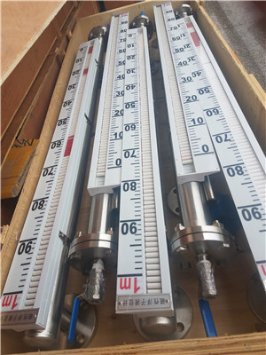 磁翻板液位計(也可稱為磁性浮子液位計)根據浮力原理和磁性耦合作用研制而成。當被測容器中的液位升降時,液位計本體管中的磁性浮子也隨之升降,浮子內的永久磁鋼通過磁耦合傳遞到磁翻柱指示器,驅動紅、白翻柱翻轉180°,當液位上升時翻柱由白色轉變為紅色,當液位下降時翻柱由紅色轉變為白色,指示器的紅白交界處為容器內部液位的實際高度,從而實現液位清晰的指示。