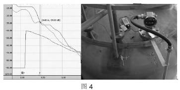 圖5為鈷礦漿化槽液位達到2.3m(量程3m)時回波包絡(luò)線圖。該液位計在投產(chǎn)初期一直正常使用,但經(jīng)過1個月后,液位發(fā)生異常波動的情況越來越頻繁,分析回波曲線后,發(fā)現(xiàn)在較低的液位(2.3m)時,回波強度也比較弱(30dB)。拆下液位計檢查后發(fā)現(xiàn)液位計表面附著了一層黑色的礦漿,導(dǎo)致液位計無法正常工作。