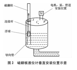 圖 2 中, B 點靠近電機和泵, 蒸餾水液位計安裝在此處既影響電機及泵的檢修, 又因泵附近液位的環(huán)流波動較大, 對浮子導向管沖刷嚴重, 故 B 點不合理; C 點處因有管道通過, 不便維護且影響管道和泵、 電機等的起吊更換, 故也不能選擇 C 點; A 點遠離泵和電機, 且有足夠的空間安裝翻板, 便于維護,所以 A 點較為合適。
