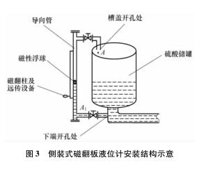 側面安裝方式的關鍵點在于: ①酸槽內壁襯有瓷磚, 故引流管上開孔應選擇槽蓋合適位置, 下孔*好在進口管上, 且均需加閥門, 便于維護; ②考慮管內硫酸在*端天氣時對磁翻柱及測量裝置的影響,因本公司循環(huán)槽溫度在75 ℃左右, 為避免夏天溫度過高影響傳感器測量, 冬天防凍, 管徑 D 應在 80mm 以上可保證正常測量。