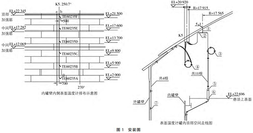 以昆侖能源華油天然氣四川廣安液化天然氣2萬方儲(chǔ)罐為例,在安裝多點(diǎn)溫度計(jì)過程中,內(nèi)罐底部溫度熱電阻需要從內(nèi)罐浮頂進(jìn)入罐內(nèi),沿罐壁垂直向下固定在罐底部。如需夾層底部溫度測(cè)量,則需要將溫度熱電阻沿外罐壁垂直而下,固定在罐底夾層的氮?dú)夤苌?,每間隔4m布置1個(gè)電纜固線器,如圖1所示。