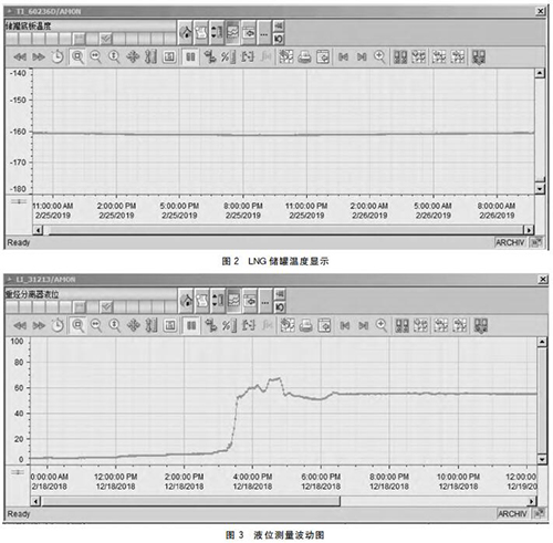然后利用多孔法蘭(結(jié)合LNG項(xiàng)目的實(shí)際情況來選擇法蘭的孔數(shù)以及尺寸大?。?,將其接到LNG罐頂?shù)臏囟茸兯推鹘泳€箱內(nèi)部,再使用多芯電纜把4~20mA信號(hào)發(fā)送到控制系統(tǒng)。現(xiàn)場(chǎng)安裝RTD熱電阻建議選用雙支,方便以后檢修更換。圖2為LNG儲(chǔ)罐溫度顯示。