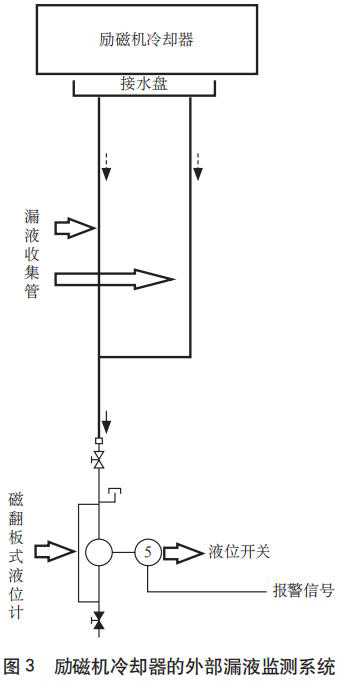 實際運行經驗表明,高壓磁翻板液位計內部銅管發生泄漏的概率較低,但一旦發生泄漏,漏液會隨著冷卻空氣沿閉合風路進入勵磁機內部,造成勵磁機短路損壞的嚴重后果。為了保證機組安全,應有冷卻器內部銅管泄漏監測裝置,然而現場沒有配置此類裝置。