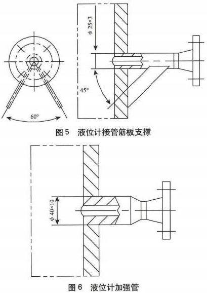 圖5是泄漏重油液位計接管結(jié)構(gòu),雖然必25mmx35mm接管的開孔補(bǔ)強(qiáng)滿足GB150-1989標(biāo)準(zhǔn)[11“開孔不另行補(bǔ)強(qiáng)”的要求,但卻不符合現(xiàn)行標(biāo)準(zhǔn)GB/T150-2011的“開孔不另行補(bǔ)強(qiáng)”要求。因?yàn)?,兩?biāo)準(zhǔn)雖然限制的設(shè)計壓力(<2.5MPa)與接管外徑(<89mm)等條件相同,但是后者改版標(biāo)準(zhǔn)卻對接管壁厚及腐蝕裕量增加了要求,這是合理的改進(jìn)完善。對于本例的425mm接管,滿足GB/T150-2011的“開孔不另行補(bǔ)強(qiáng)”條件的管壁厚度至少應(yīng)為5.5mm(按標(biāo)準(zhǔn)規(guī)定當(dāng)腐蝕裕量為1mm時,接管厚度應(yīng)不小于3.5mm)。所以,按HG/T20583-2011對小接管避免彎曲而推薦的加強(qiáng)結(jié)構(gòu)優(yōu)先選用加強(qiáng)管形式建議將液位計接管更改為圖6的加強(qiáng)管結(jié)構(gòu)。這樣不但解決了小接管的開孔補(bǔ)強(qiáng)和防彎曲加強(qiáng)問題,也可以使小接管的設(shè)計使用年限與罐體一致,而且便于保證小接管與罐體采用插人式全焊透角焊縫的焊接質(zhì)量。
