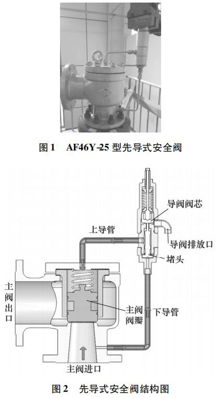 凝結水液位計常見的故障包括: 主閥導閥泄漏、導閥超壓不動作、主閥未隨導閥動作。主閥導閥泄漏失效原因: 密封面臟污或損傷,零部件卡阻、密封墊圈老化變形; 導閥超壓不動作失效原因: 導閥密封面銹蝕粘合或材料變形、導閥彈簧過緊或卡阻、導閥下導管堵塞; 主閥未隨導閥動作失效原因: 主閥運動卡阻、導閥排氣量過小。然而,安全閥起跳不回座故障在試驗過程及工業(yè)現(xiàn)場也是非常常見的,國內對于凝結水液位計起跳不回座失效分析的相關研究較少。本研究以某公司生產的 AF46Y-25 型凝結水液位計為研究對象,研究導閥結構并分析其動作過程。在對其開展動作性能試驗時,發(fā)現(xiàn)該安全閥實際回座壓力遠低于標準要求,排放時間過長,回座失效。因此,對其進行受力分析,以探討回座失效的原因。