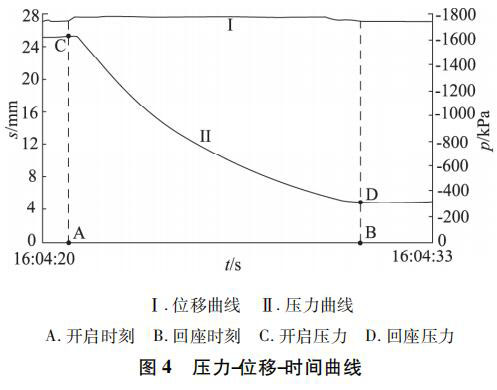 運用安全閥冷態(tài)試驗裝置對該凝結水液位計進行動作性能試驗,將試驗容器內的介質壓力卸放到整定壓力以下,開啟試驗容器和安全閥進口端的球閥,關閉流量計管路閥門,開啟主測試管路截止閥,開啟儲氣容器通向試驗容器的節(jié)流閥,逐漸加壓,同時啟動計算機數(shù)據(jù)采集系統(tǒng),被試安全閥開啟,繼續(xù)升高壓力,直至被試安全閥保持全開啟( 排放) 狀態(tài),然后關閉儲氣容器通向試驗容器的閥門,被試安全閥亦逐漸關閉。計算機自動生成試驗過程的壓力、位移曲線,試驗人員記錄采集開啟壓力、排放壓力、回座壓力、開啟高度等數(shù)據(jù)。重復上述試驗至少 3 次,得到相應壓力-位移-時間曲線,見圖 4。左縱坐標為位置,右縱坐標為壓力,其中上部曲線代表導閥位移,下部曲線代表壓力變化。當導閥位置發(fā)生變化,代表導閥開始開啟動作,此時的壓力為該凝結水液位計的開啟壓力,即整定壓力; 當導閥位置回到原點代表導閥已經回座,此時對應的壓力即為回座壓力。