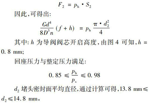 當系統(tǒng)壓力降低到回座壓力時,導閥彈簧要克服堵頭密封面處的密封力將其打開,此時應滿足: