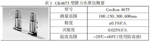 GeoKon 4675 型靜力水準(zhǔn)儀是一種高精密液位系統(tǒng),該系統(tǒng)設(shè)計是 用于測量多點相對沉降的系統(tǒng)。在使用中,一系列的傳感器容器均采用PVC 液管聯(lián)接,每一容器的液位由一精密振弦式力傳感器測出,該傳感 器內(nèi)有一個自由懸重,一旦液位發(fā)生變化,懸重的懸應(yīng)浮力即被傳感器感,精確測出小至 0.025mm 的垂直變化。在多點系統(tǒng)中,所有傳感器的垂 直位移均是相對于其中的一點,該點的垂直位移是相對恒定的或者可用其它人工觀測手段準(zhǔn)來確定。