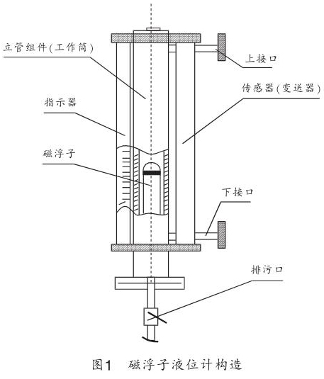 遠(yuǎn)傳式電伴熱型磁翻板液位計(jì)由磁浮子、工作筒、指示器、遠(yuǎn)傳變送器組成,如圖 1 所示。
