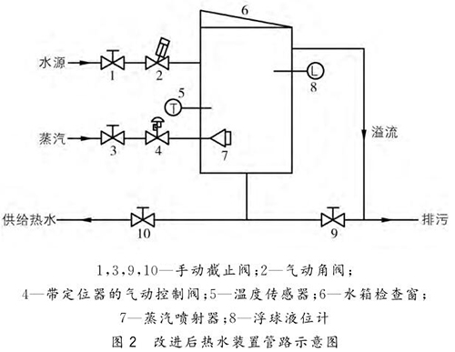 針對造成熱水裝置問題的原因,提出了以下改進原則:為了改進后水罐便于維修和保養,確定把水罐改成水箱;為解決水溫分層以及設備震動,確定把環形加熱管更換為蒸汽噴射器;為解決液位檢測失效,確定把浮球磁翻板液位計更換為浮球液位計;為解決水溫控制波動大,把蒸汽進汽角閥改為帶定位器的氣動控制閥,以便調節蒸汽進汽量。