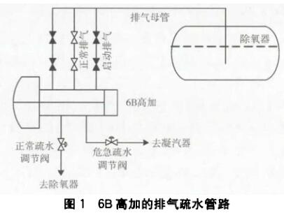 6B高壓加熱器設(shè)有2路啟動(dòng)排氣和1路正常排氣,3路排氣管道匯至1根管道進(jìn)人除氧器并插人除氧器正常液面以下,如圖1所示。啟動(dòng)階段高壓加熱器啟動(dòng)排氣閥門和正常排氣閥門均開啟排氣,正常運(yùn)行時(shí)啟動(dòng)排氣閥關(guān)閉,正常排氣閥開啟。排氣管線從7.5 m平臺(tái)經(jīng)過多次折向匯集到23 m排氣母管,然后再引人除氧器,這導(dǎo)致排氣管線存有蒸汽冷凝水;由于在排氣管線上存有一定的冷凝水,啟動(dòng)排氣閥開啟后,存在于排氣管道的冷凝水依靠重力排至高壓加熱器汽側(cè),在啟動(dòng)排氣管至除氧器的管路中形成一定的真空,從而產(chǎn)生虹吸作用,使除氧器的水吸人6B高壓加熱器,導(dǎo)致B側(cè)高壓加熱器液位異常升高而發(fā)生解列。