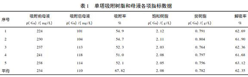 (1) 技改原理: 新樹脂入廠檢驗,飽和樹脂容量可以達到 2. 5 ~ 2. 8g /L。但在實際生產(chǎn)中由于含液位計母液的通過量不足,造成樹脂的吸附率較低,新樹脂飽和樹脂容量一般在 2. 0 ~ 2. 2g /L 之間。通過再增加一組吸附塔來進行雙塔吸附,即提高了樹脂利用率,又充分利用了母液,提高樹脂的飽和度。采用雙塔交叉吸附工藝的升級改造,是在原有單塔吸附的基礎上增加一個吸附塔和一臺母液進塔泵。兩臺母液進塔泵分別向兩個吸附塔同時供液樹脂吸附飽和后,兩個吸附塔樹脂交叉進行下步解吸工藝。表 1為單塔吸附工藝生產(chǎn)中取用的一組數(shù)。