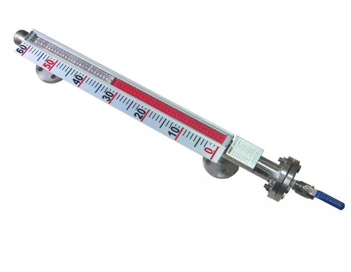 磁性浮子液位計是基于連通器和磁性耦合原理實現液位實時測量的。當被測容器中的液位升降時,浮筒內的磁性浮子也隨之升降,浮子內的永久磁鋼通過磁性耦合驅動浮筒外部的磁性翻片翻轉180°,翻片兩面分別涂有不同的顏色(通常為紅色和白色),以指示液位的位置。一般地,當容器內液位上升時,翻片由白色轉變為紅色,當容器內液位下降時,翻片由紅色轉變為白色,指示器的紅白交界處即為容器內液位的實際高度,從而實現液位的準確測量。