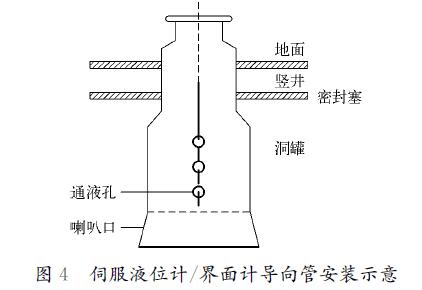 儀表安裝應(yīng)便于儀表維護(hù)、更換及觀測(cè),儀表的觀測(cè)面應(yīng)朝向操作通道,周圍不應(yīng)有妨礙維修儀表的物件,因而洞罐液位計(jì)、界面計(jì)和多點(diǎn)平均溫度計(jì)的變送單元均安裝在豎井口。考慮到洞罐埋設(shè)深度及洞罐儀表檢測(cè)元件的長(zhǎng)度,為便于儀表安裝,保護(hù)洞罐儀表的檢測(cè)元件,為伺服液位計(jì)、伺服界面計(jì)及多點(diǎn)平均溫度計(jì)設(shè)置了液位計(jì)、界面計(jì)導(dǎo)向管及溫度計(jì)保護(hù)管。導(dǎo)向管、保護(hù)管安裝時(shí),從上到下的垂直誤差一般小于導(dǎo)向管、保護(hù)管口徑的10%,并徹底處理好導(dǎo)向管通液孔的毛刺;焊接必須采用套焊,焊縫必須清理干凈;安裝時(shí),必須保證洞罐儀表與導(dǎo)向管、保護(hù)管連接法蘭的水平度,一般控制在1°之內(nèi),伺服液位計(jì)、界面計(jì)導(dǎo)向管安裝示意如圖4所示。