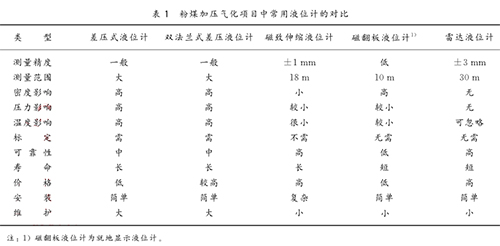 目前在粉煤加壓氣化項目中常采用的液位計類型主要有:差壓式液位計、雙法蘭式差壓液位計、磁致伸縮液位計、磁翻板液位計、雷達液位計等。這幾種液位計各有特色,都存在著一定的優勢與不足,性能對比結果見表1所列。