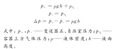 在粉煤加壓氣化工藝流程中,冷卻水、冷凝水是干凈潔凈的介質,測量該介質的液位如無特殊情況,選用普通的差壓式液位計即可。差壓式液位計是利用流體靜力學原理,通過測量流體的壓差來計算出液位的高低,其測量原理如圖1所示。這種方法簡捷、方便,但是準確度與穩定性不高,而且測量結果受到介質密度的影響,為滿足測量精度常需要進行補償或采用組合式儀表測量方案。