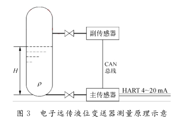 c)對膜片的材質要求較高。為防止腐蝕與氫脆現象,需要選用316L鍍金膜片,成本較高。同時由于介質的易沉積性,在加裝沖洗吹掃裝置后,仍然需要定期清理更換膜片,以保證測量精度。2)改進的電子遠傳液位變送器。在后續的項目中采用改進的電子遠傳液位變送器,其測量原理如圖3所示。該種電子遠傳液位變送器取消了傳統的毛細管引壓方式,使用主、副2個壓力傳感器,分別安裝于容器的底部與上方,用來測量高低壓側的壓力。2個壓力傳感器以CAN總線的方式連接到一起,并且將副傳感器接收到的壓力信號傳至主傳感器中進行差壓計算,計算完成后轉換成標準的4~20mA信號輸出。