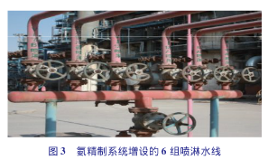 2)液氨儲罐增設噴淋系統。液氨易溶解于水,裝置增設霧狀水噴淋系統后,一旦液氨泄漏,從現場打開水噴淋系統,就可*大減少氨的揮發。另外氨具有較高的體積膨脹系數。如:滿量充裝液氨的鋼瓶,在0~60℃范圍內,液氨溫度每升高1℃,其壓力升高約1.32~1.80MPa,致使液氨氣瓶超裝*易發生爆炸。為此液氨裝車點、液氨儲罐設置了降溫噴淋裝置。同時,要求用罐車拉運液氨時,其充裝系數不得大于0.9。在新建120t/h的酸性水汽提裝置中,不但在液氨儲罐上增設噴淋系統,而且在粗氨分液罐、氨結晶器、氨液循環罐等6組設備均增設了噴淋系統。具體見圖3。